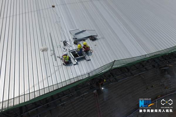 為準(zhǔn)備體育場(chǎng)屋面吊頂施工,吊裝工人正在安裝吊頂構(gòu)件。新華網(wǎng) 伍嘉煒攝