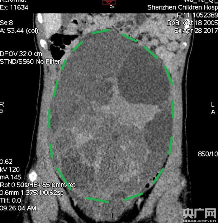 小琪來自粵東農(nóng)村,因?yàn)樽晕腋杏X腹痛1天,于是在父母的陪伴下來到深圳市兒童醫(yī)院就診。門診醫(yī)生一眼就發(fā)現(xiàn)孩子的腹部異常隆起,仿佛懷孕數(shù)月的孕婦一般。經(jīng)過超聲檢查,發(fā)現(xiàn)小琪腹部巨大占位性病變。醫(yī)生考慮為腹腔巨大腫瘤,立即將小琪收入普外一科住院。