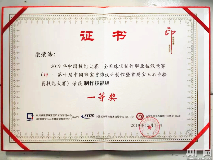 梁榮浩在2019全國珠寶制作職業技能競賽中獲職工組一等獎。(央廣網發 受訪者供圖)