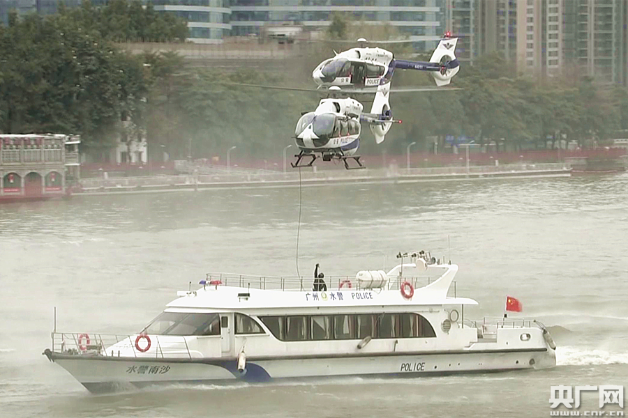 特警落船的一瞬間,博得現場觀眾的陣陣掌聲。這是廣州公安水空綜合演練的一幕,模擬珠江上一艘船艇出現被劫持的突發狀況,廣州特警索降安全解救人質的場景。