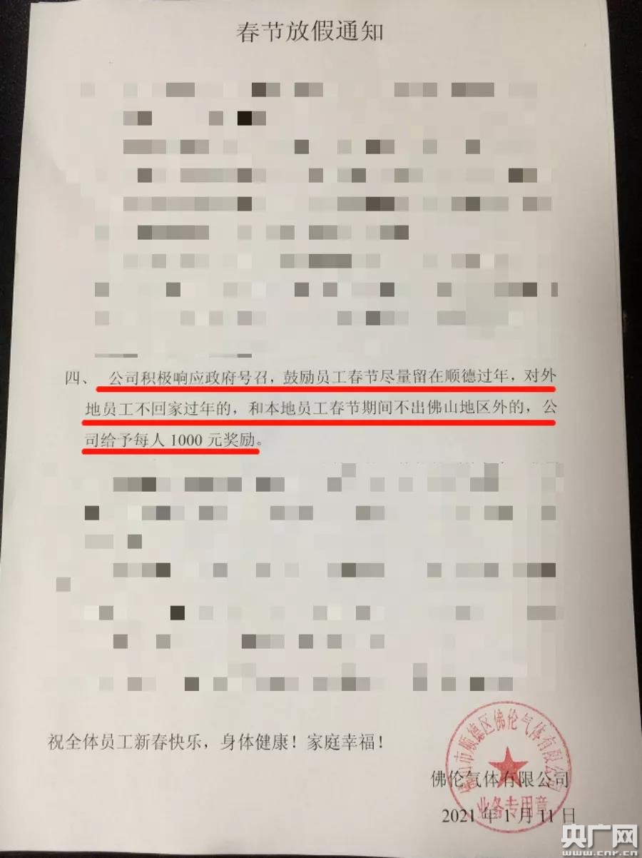 佛山順德一家企業推出暖心舉措,“真金白銀”獎勵留在本地過年的員工(央廣網發 受訪者供圖)