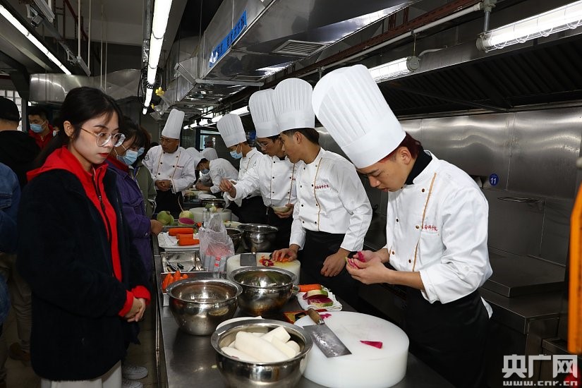 國賽選手在順德廚師學院課堂了解雕花技藝。(央廣網發)