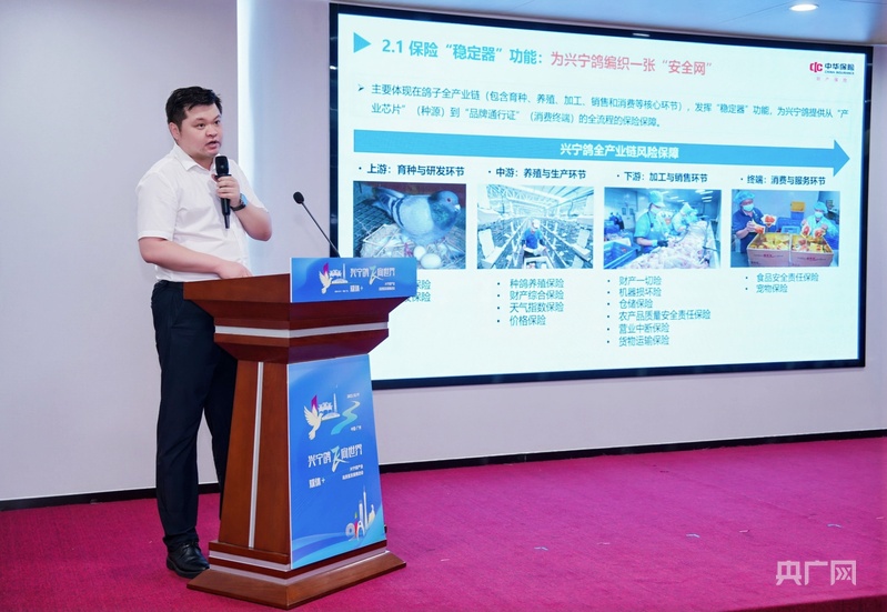 中華財險廣東分公司鄉(xiāng)村振興部、農(nóng)村事業(yè)部主要負責(zé)人馮庭松以《強化產(chǎn)業(yè)韌性:保險如何成為鴿子產(chǎn)業(yè)鏈的“穩(wěn)定器”與“加速器”》為題發(fā)表演講。