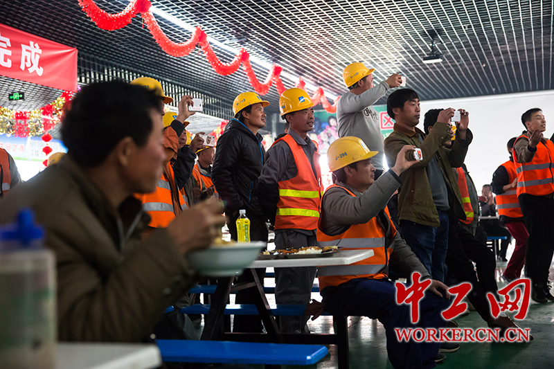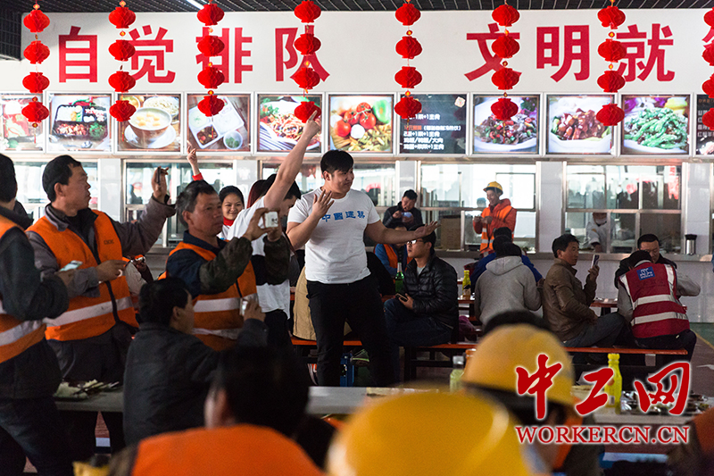 歌曲唱罷,一個人拿起喇叭喊話,“你干嘛呢?”另一個人拿著掃帚說,“我在學(xué)雷鋒呢”,話音剛落,從食堂的四面八方聚集一群演員,跳起了歡快的舞蹈。現(xiàn)場的農(nóng)民工兄弟紛紛拿出手機,記錄下這驚喜的一幕。“他們不知道從哪里冒出來的,太驚喜,太感動了,我已經(jīng)錄下來了,回家給我家里人瞧瞧”。這是現(xiàn)場的一位農(nóng)民工兄弟告訴主辦方的。現(xiàn)場,還有許多農(nóng)民工兄弟們被熱烈的氣氛鼓舞,與演員們一起互動,一起跳舞,一起歌唱,非常開心。 中工網(wǎng)記者李雪峰 攝 -