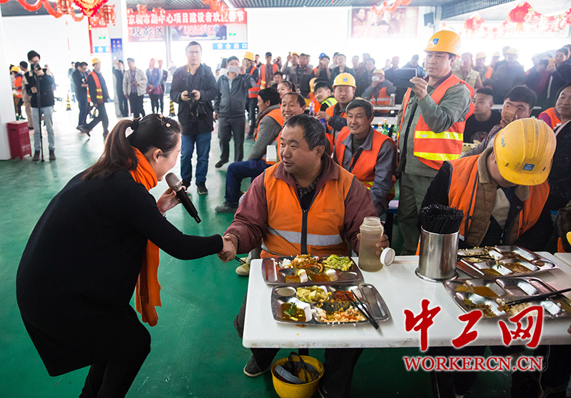 “學(xué)習(xí)雷鋒好榜樣……”伴隨著熟悉的旋律,3月16日中午,在中建一局北京城市副中心工地的食堂里,突然出現(xiàn)一群人唱起了歌。原來,這是全國總工會在中建一局北京城市副中心工地舉辦的一場學(xué)雷鋒“快閃”志愿活動。中工網(wǎng)記者 李雪峰 攝 -