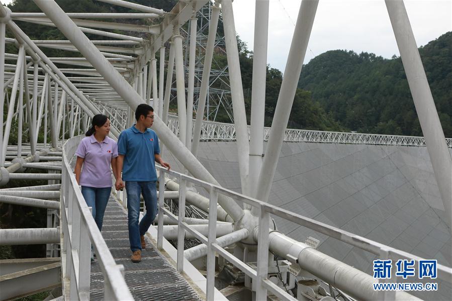 孫純(左)與石向瑋在FAST總控室內觀看FAST全景圖(8月9日攝) 新華社記者張傳奇 攝 在世界最大單口徑射電望遠鏡——500米口徑球面射電望遠鏡(FAST)項目組,光信息科學專業畢業的孫純和熱能與動力工程專業畢業的石向瑋因FAST結緣,在今年7月完婚。他們的結合,被同事們戲稱為“光”與“熱”的結合。 -