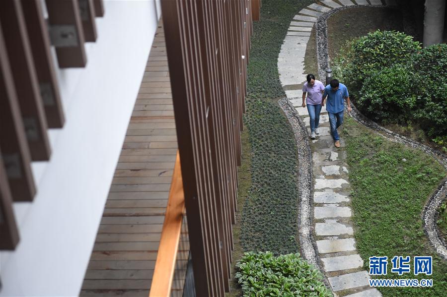孫純(左)與石向瑋在公寓內綠化帶上散步(8月9日攝)。新華社記者歐東衢 攝 -