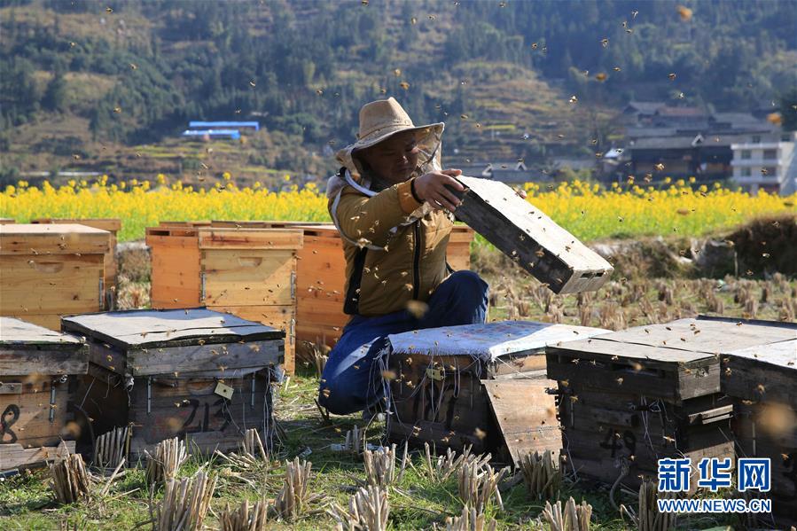 2月5日,在貴州省榕江縣忠誠(chéng)鎮(zhèn)安樂(lè)村,蜂農(nóng)趙光帥在查看蜜蜂產(chǎn)蜜情況。近日,貴州省榕江縣天氣晴朗,春花綻放,蜂農(nóng)們也開(kāi)始在花田中忙碌起來(lái)。新華社發(fā)(李長(zhǎng)華 攝) -