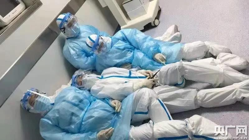 1月6日凌晨5時,換崗后準備脫下隔離服的醫護人員坐在病區外走廊短暫休息。