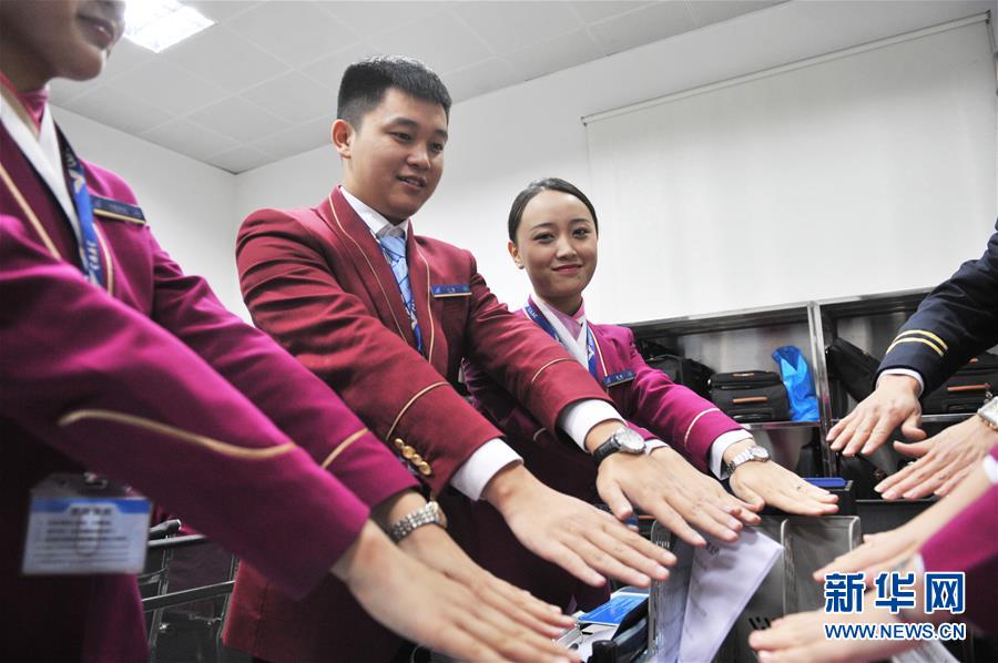 2月1日,在南航海口美蘭基地,梁鶴(右)在出發(fā)前為丈夫?qū)幦逭碇b。新華社發(fā)(楚洪雨 攝) 春運(yùn)首日,南航90后夫妻乘務(wù)員寧儒和梁鶴共同執(zhí)行從海口至哈爾濱的航班任務(wù),一同在崗位上開始了春運(yùn)的忙碌。小兩口于2015年入職南航,工作后相識(shí)相戀,于2017年結(jié)婚。 -