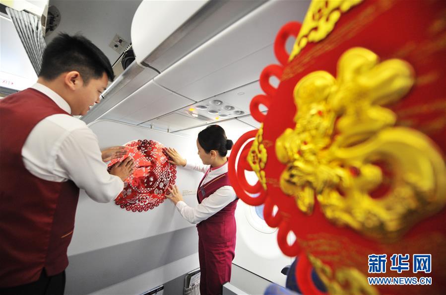 2月1日,寧儒(左)和梁鶴在旅客登機(jī)前裝飾客艙,讓旅客提前感受過年的喜慶氛圍。新華社發(fā)(楚洪雨 攝) -