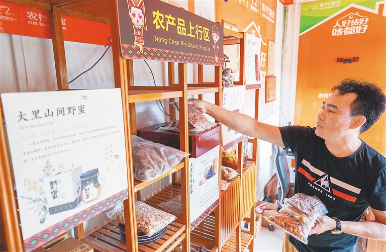 近日,在陵水黎族自治縣本號鎮小妹村農村淘寶店中,工作人員正在整理特色農產品,準備通過物流發往各地。