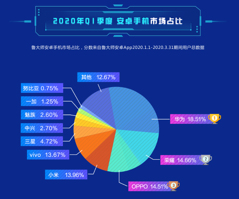 在這種“逆境下”,華為、榮耀的市場份額依舊保持著遙遙領先的姿態。根據魯大師2020年Q1季度安卓新增市場占比來看,華為、榮耀兩者加起來就占據了Q1市場33.17的份額,甩開了其他國產品牌一大截,實現了逆勢增長。