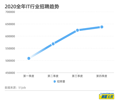 根據前程無憂無憂指數數據庫顯示,截止到2020年年底,IT類職能(IT類職能為:計算機/互聯網/通信/電子,下同)招聘職位總量近64萬個,與去年同期相比上升9個百分點。
