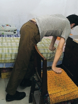 這樣保持了兩分鐘,他開始用手撐住腳部慢慢向上挪動,到膝蓋位置時他喘了口氣,右手扶住膝蓋,左手扶住椅子,身體仍90度彎曲。就這樣,他靠著椅子做支點(diǎn),上半身帶動下半身,讓僵硬的兩條腿向床邊靠近。