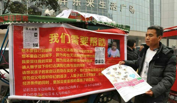 如今,他一邊尋找孩子一邊走街串巷向人們宣傳防拐孩子知識(shí)。1月28日,記者致電伍興虎。他說(shuō):在許昌感謝眾多好心人的幫助,已經(jīng)從許昌走到新鄭了。昨晚,他在網(wǎng)友——“禹州風(fēng)”的幫助下住在新鄭某旅館,今天還要啟程冒雪踏上尋子路,目前,伍興虎有一個(gè)4歲的兒子和2歲的女兒,在老家由媳婦和母親一起照看。而自己是獨(dú)自騎車(chē)走遍全國(guó)各個(gè)地市踏上尋子之路。孩子丟失時(shí),只有13個(gè)月大。在2008年12月10日凌晨2點(diǎn)多。一家人在睡夢(mèng)中醒來(lái)發(fā)現(xiàn)孩子不見(jiàn)了,而自己家的大門(mén)敞開(kāi)著。他說(shuō)自己家是農(nóng)村的,離公路約兩里路。偷走自己兒子的罪犯一定是有預(yù)謀,開(kāi)車(chē)偷走的。當(dāng)時(shí),睡夢(mèng)中的一家人醒來(lái)著急痛哭報(bào)案尋找,可至今無(wú)果。于是,自己下決心走上尋子路。他每到一處,給大家發(fā)放宣傳單和伍嘉誠(chéng)一歲時(shí)的照片和身份信息。傳單上還印著別的地方丟失孩子的信息。
