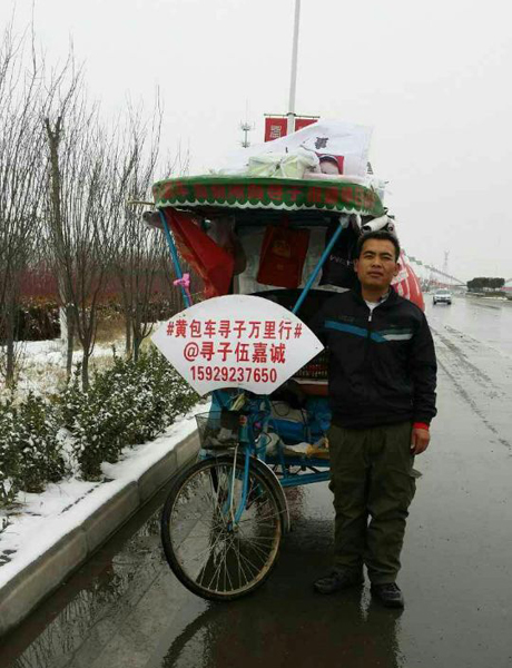 伍興虎跑遍中國(guó)的交通工具是一輛人力三輪車(chē),車(chē)身上寫(xiě)著“尋人啟事”、“黃包車(chē)萬(wàn)里尋子”等字樣。車(chē)上還放著《寶貝回家》的歌曲。他將印有防拐知識(shí)的尋子傳單發(fā)給圍觀群眾。