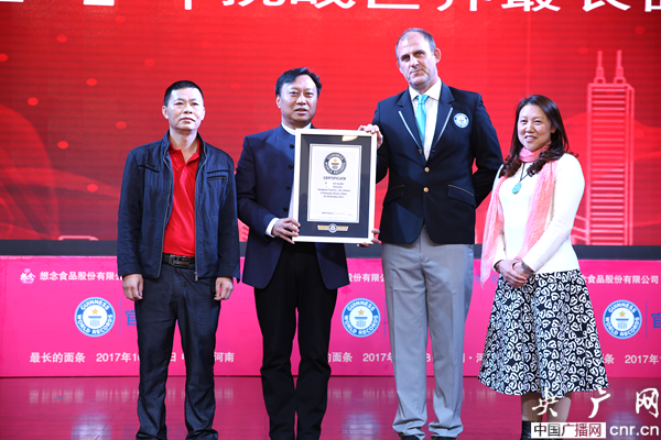 “整整十年,都沒有人能真正打破最長面條吉尼斯世界紀錄,可想而知挑戰這項紀錄有多難。但是這次想念食品不僅成功打破了這一紀錄,而且將紀錄定格在了3048.32米,這太不可思議了。我預計未來很長一段時間內,都不會有人能打破這一紀錄,恭喜想念食品!”John Garland在頒發證書時講道。