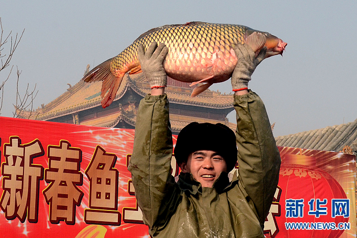 央廣網河南分網消息 據新華網報道:1月18日,一位漁業工作人員展示一條重達19.7斤的“鯉魚魚王”。當日,2014首屆河南開封龍亭開漁節暨“新春魚王”拍賣會在河南省開封市龍亭湖舉行。市民和游客冒著嚴寒來到現場,觀看捕魚、稱重、拍賣過程,并隨意挑選剛捕撈的各類鮮魚,為新春佳節準備年貨。