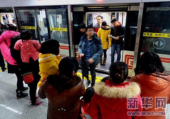 鄭州市民在乘車體驗(yàn)“地鐵速度”(2013年12月28日攝)。當(dāng)日開通試運(yùn)營(yíng)的鄭州軌道交通1號(hào)線(一期工程)是河南省第一條地鐵線路。