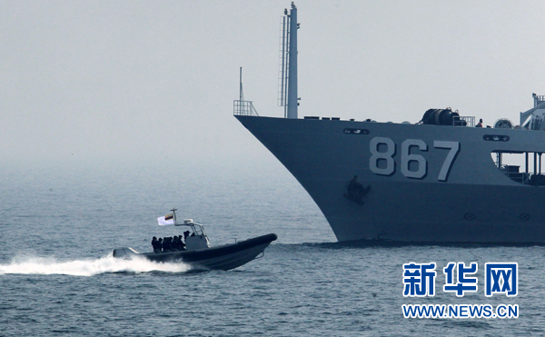 4月23日,文萊海軍“達魯伊山”號巡邏艦派出小艇搭載救援人員快速駛向“失事船舶”。新華社記者查春明 攝