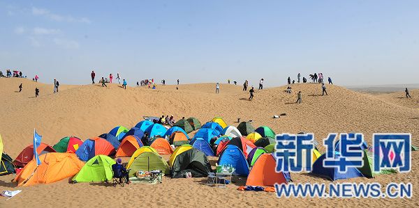 5月1日,在寧夏兵溝景區的沙漠中,大批游客扎帳篷夜宿沙漠。