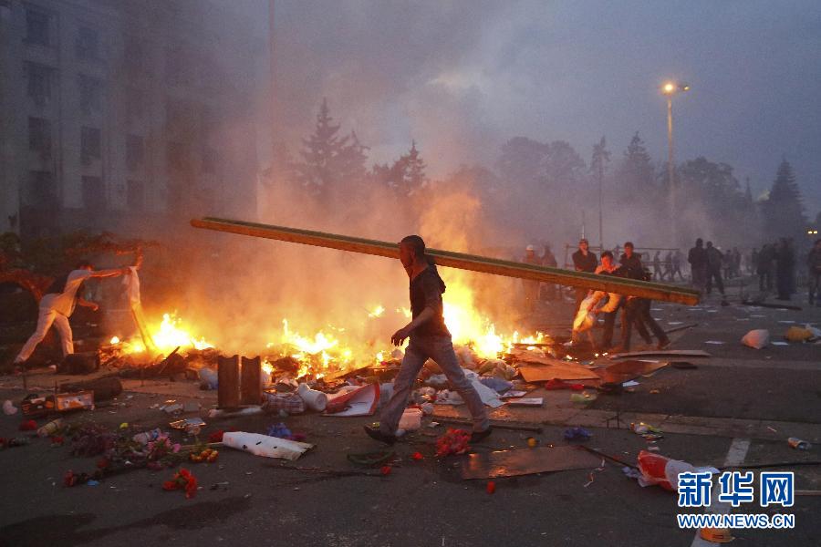 央廣網(wǎng)河南分網(wǎng)消息 據(jù)新華網(wǎng)報(bào)道:繼烏克蘭軍警5月2日凌晨對(duì)烏東部城市斯拉維揚(yáng)斯克發(fā)起攻勢(shì)后,烏南部黑海沿岸城市敖德薩同日發(fā)生親政府與反政府兩派民眾沖突,造成嚴(yán)重人員傷亡。烏克蘭東部局勢(shì)持續(xù)緊張。一名歐盟成員國駐布魯塞爾的高級(jí)外交官對(duì)新華社記者表示,他認(rèn)為,隨著烏克蘭軍方2日(向反政府武裝人員)發(fā)起攻擊,烏克蘭內(nèi)戰(zhàn)已經(jīng)打響。5月2日是烏克蘭危機(jī)發(fā)生質(zhì)變的節(jié)點(diǎn)。俄羅斯聯(lián)邦委員會(huì)國際事務(wù)委員會(huì)副主席克里莫夫認(rèn)為,在敖德薩和烏克蘭東南部發(fā)生的流血事件可以視為烏克蘭內(nèi)戰(zhàn)的序幕。圖為5月2日,在烏克蘭南部城市敖德薩,工會(huì)大樓附近的一個(gè)臨時(shí)帳篷被燒毀。烏克蘭南部黑海沿岸城市敖德薩2日發(fā)生親政府與反政府兩派民眾沖突,導(dǎo)致43人死亡。新華社發(fā)