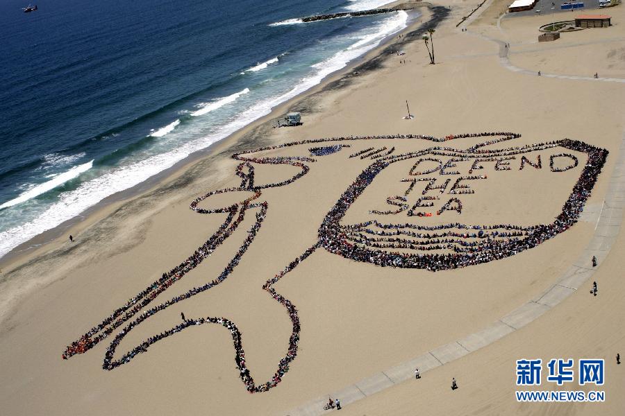 在美國洛杉磯的一處海灘上,人們排列出“保護海洋”的字母和圖案呼吁對海洋的保護。(2012年6月7日攝) 新華社