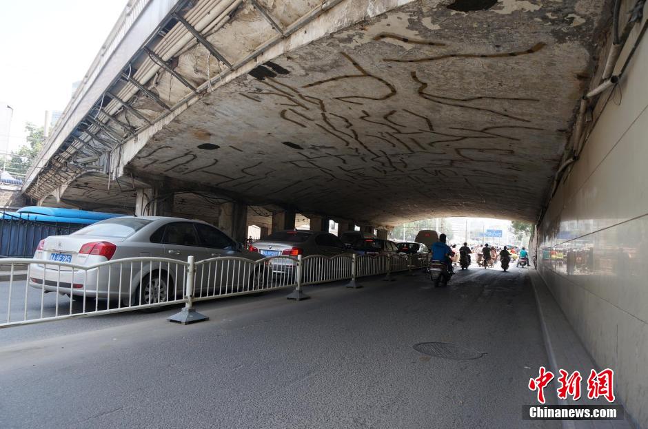 央廣網河南分網消息 據中新網報道:7月16日,記者現場看到,數百條“補丁”錯綜復雜貼于橋底頂部,讓人眼花繚亂。該橋連接火車站與二馬路汽車站,每天都有大量汽車、行人從上面通過。看見這些“補丁”,過往市民稱,既然有問題就得修,僅用補丁修復裂縫不靠譜,不知是否還存有安全隱患,從這走過著實讓人心慌。圖為鄭州二馬路跨正興街的馬路橋,橋底頂部布滿“補丁”。(周小云攝)