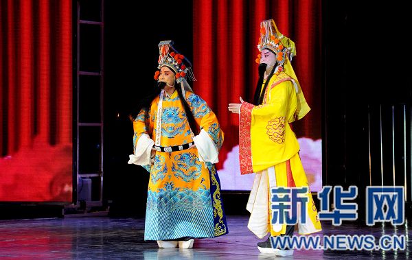 央廣網(wǎng)河南分網(wǎng)消息 據(jù)新華網(wǎng)河南頻道報(bào)道:當(dāng)日,位于鄭州的河南藝術(shù)中心如意湖文化廣場(chǎng)上演一場(chǎng)豫劇盛宴,唐派傳人表演唐派經(jīng)典名段,紀(jì)念豫劇名家、唐派創(chuàng)始人唐喜成先生誕辰90周年。(新華社記者 朱祥 攝)