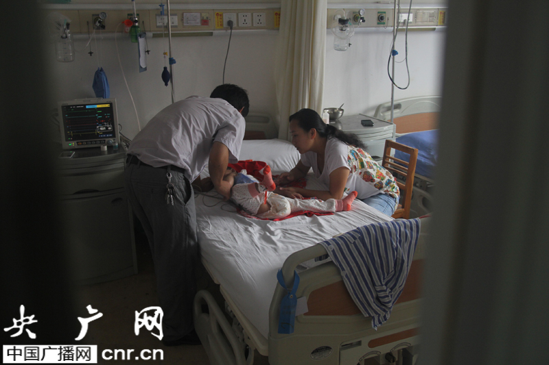2014年8月29日晚9點半左右可以探望奇奇了,見到奇奇那一刻,奇奇的父親淚止不住的往下流,小奇奇用她那慣常的撅嘴巴方式來向父親表示歡迎,嘴里微弱的發出:媽媽,講個故事吧。聽著媽媽哭著講小兔子乖乖,奇奇手舞足蹈,所有的顧慮和擔心全化為淚水,盡情揮灑。