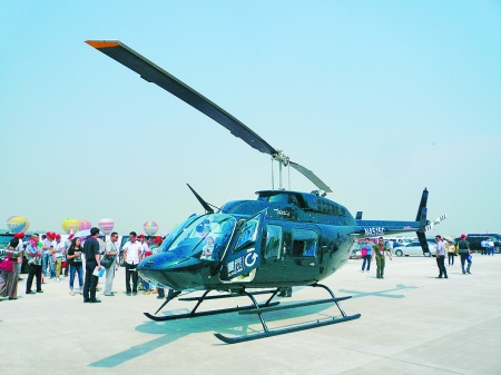 在通往開(kāi)幕式的必經(jīng)道路上,該公司部署了一架美國(guó)貝爾大型直升機(jī)供來(lái)往游人觀看、留影。據(jù)該公司的負(fù)責(zé)人朱明明介紹,這種直升機(jī)的最低價(jià)格2000多萬(wàn)元人民幣,這一架是該公司購(gòu)買(mǎi)的第一架直升機(jī)。隨后他們還將購(gòu)買(mǎi)13架價(jià)位不等的貝爾直升機(jī)和4架型號(hào)不同的羅賓遜直升機(jī)落戶(hù)安陽(yáng),用于打造國(guó)內(nèi)首家直升機(jī)4S店。