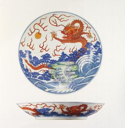 上海斗寶藝術展出青花斗彩海水龍紋盤