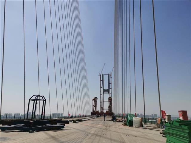 記者看到,安九鐵路鳊魚洲長江大橋位于長江下游河段,與福銀高速公路九江長江二橋相望。爬上橋面,只見兩座H型結(jié)構(gòu)的主塔高聳,其中北主塔高252米,約80余層樓高;南主塔高242米,已于去年12月30日封頂。