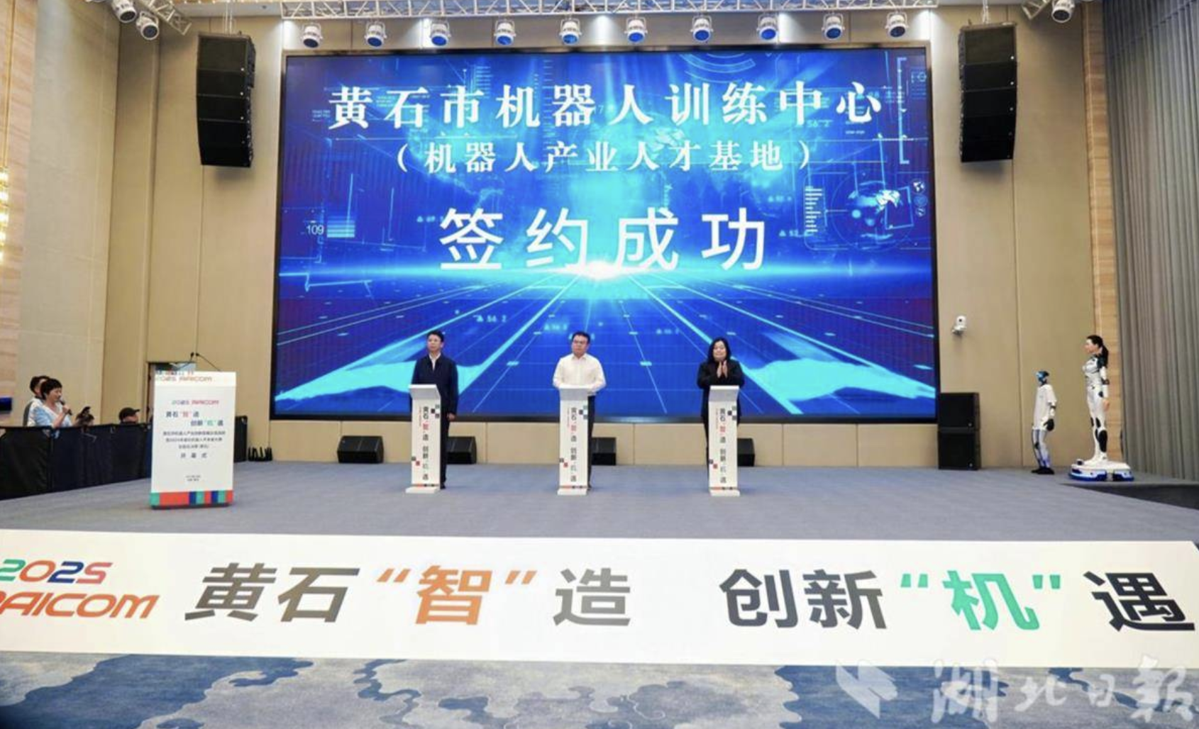 10月18日,黃石市機(jī)器人產(chǎn)業(yè)創(chuàng)新發(fā)展交流會暨2025年睿抗機(jī)器人開發(fā)者大賽全國總決賽開幕式現(xiàn)場,黃石機(jī)器人智能制造產(chǎn)業(yè)園正式揭牌,黃石市機(jī)器人訓(xùn)練中心(機(jī)器人產(chǎn)業(yè)人才基地)簽約成立。