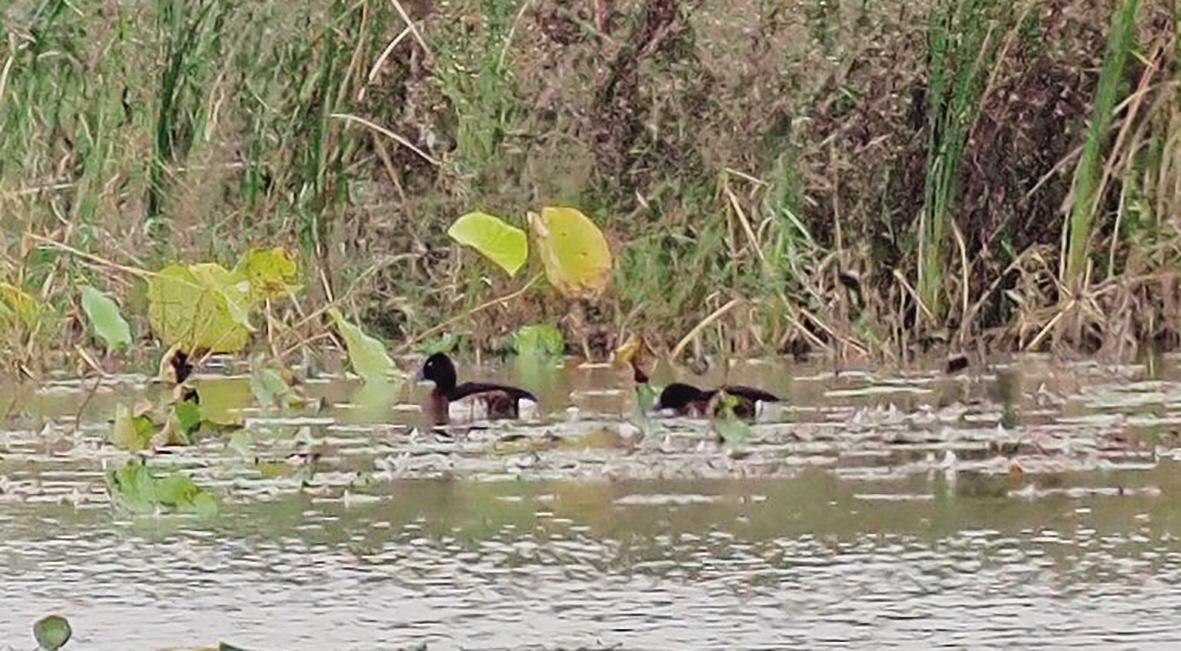 ▲藏身荷塘中的兩只青頭潛鴨 武漢市觀鳥協(xié)會(huì)供圖