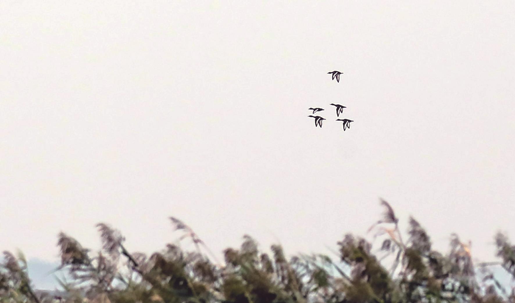 17日上午9時(shí)許,武漢市觀鳥協(xié)會(huì)副會(huì)長(zhǎng)姚波帶領(lǐng)11名調(diào)查人員對(duì)蔡甸沉湖國(guó)際重要濕地進(jìn)行生物多樣性調(diào)查。當(dāng)時(shí)一片幾個(gè)足球場(chǎng)大的水塘上,100多只綠頭鴨和1000多只羅紋鴨已如期遷徙至此,唯有兩只青頭潛鴨在一旁單獨(dú)活動(dòng);另外,距此水塘2公里左右的荷塘里,又發(fā)現(xiàn)兩只青頭潛鴨,大家精神振奮。之后,姚波從一張抓拍的鳥兒空中飛行照片中驚喜地發(fā)現(xiàn),自由飛翔的5只鴨,原來(lái)也是青頭潛鴨。