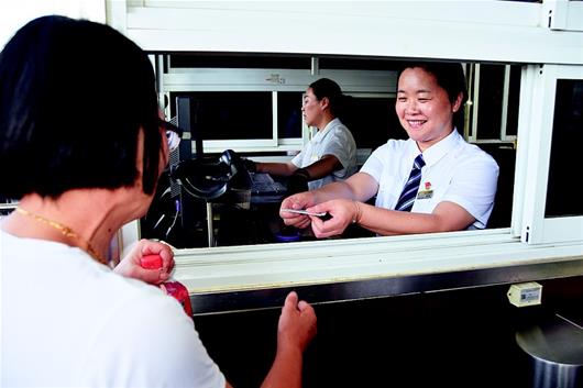 正值暑運高峰期,武昌火車站售票大廳內人頭攢動,楊濤在售票窗口里幫旅客出票。