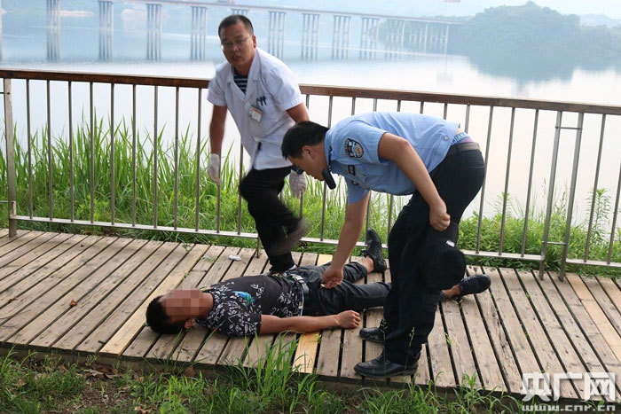 民警趕到現場后迅速展開尋找并在武當山太極湖碼頭附近路段一木亭處發現遺留血跡,但卻未發現輕生小伙的身影,經核實該處和涂某發送的微信視頻地點一致;為了盡快找到該小伙,民警兵分幾路一路小跑在事發地周邊尋找,通過不懈努力,18時50分許,民警白鵬等人在環湖游步道上將依靠在湖邊柵欄旁的涂某找到,此時該小伙已處于極度虛弱狀態,繼而陷入昏迷狀態,經簡單包扎后,民警合力將涂某送往醫院救治,經醫生搶救,涂某逐漸蘇醒,目前傷勢已無大礙。事后,民警通過微信群向家屬們報平安。