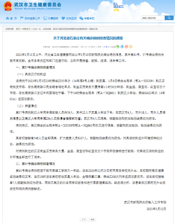 央廣網武漢1月12日消息 據武漢市衛生健康委員會1月12日通報顯示,2021年1月11日上午,河北省衛生健康委網站公布1月10日新冠肺炎確診病例信息,其中第41號、57號確診病例與我市有關聯。全市各有關區和部門迅速行動,立即開展排查、封控、流調、消殺等工作。