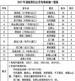 祭掃專線開通時(shí)間為3月27日、28日,4月3日至5日,共5天。共有13條專線,在市內(nèi)設(shè)有12個(gè)乘車點(diǎn),分別開往歸元陵園、睡虎山、孝恩陵園、流芳陵園、千子星空、幸福山公墓、萬福凈土、石門峰、壽安陵園、玉筍山、回民公墓等墓區(qū)。