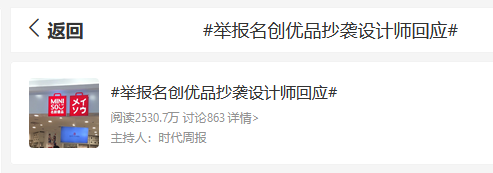 隨后,名創優品被設計師舉報抄襲的消息迅速發酵,相關話題登上微博熱榜單。兩天內,#名創優品被設計師舉報抄襲#的話題閱讀量超2.3億。當日下午,名創優品客服表示,已經報備相關部門進行核查。