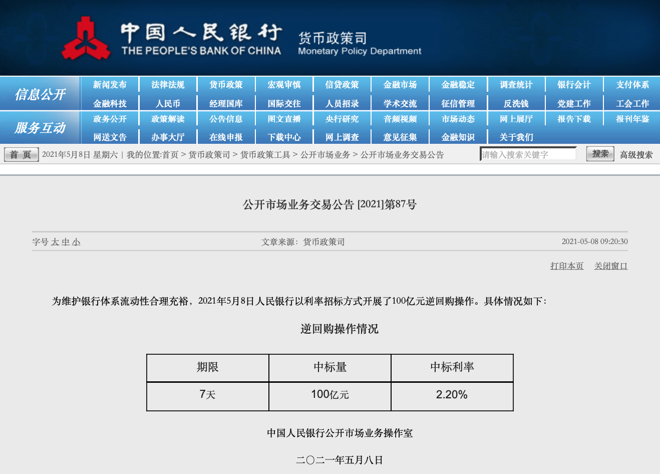 央廣網(wǎng)北京5月8日消息(記者 張圣琪)記者從央行網(wǎng)站了解到,中國央行公開市場進行100億元7天期逆回購操作,無逆回購到期;中標利率2.2%,與此前持平。