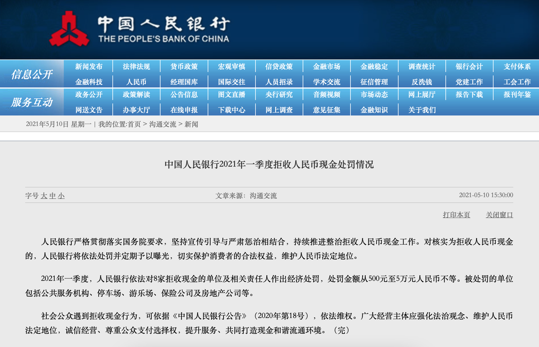 據(jù)悉,2021年一季度,人民銀行依法對(duì)8家拒收現(xiàn)金的單位及相關(guān)責(zé)任人作出經(jīng)濟(jì)處罰,處罰金額從500元至5萬(wàn)元人民幣不等。被處罰的單位包括公共服務(wù)機(jī)構(gòu)、停車(chē)場(chǎng)、游樂(lè)場(chǎng)、保險(xiǎn)公司及房地產(chǎn)公司等。