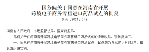央廣網(wǎng)北京5月14日消息(記者 黃昂瑾)記者從中國政府網(wǎng)獲悉,國務(wù)院12日批復(fù)同意在河南省開展跨境電子商務(wù)零售進(jìn)口藥品試點(diǎn),試點(diǎn)期為自批復(fù)之日起3年。
