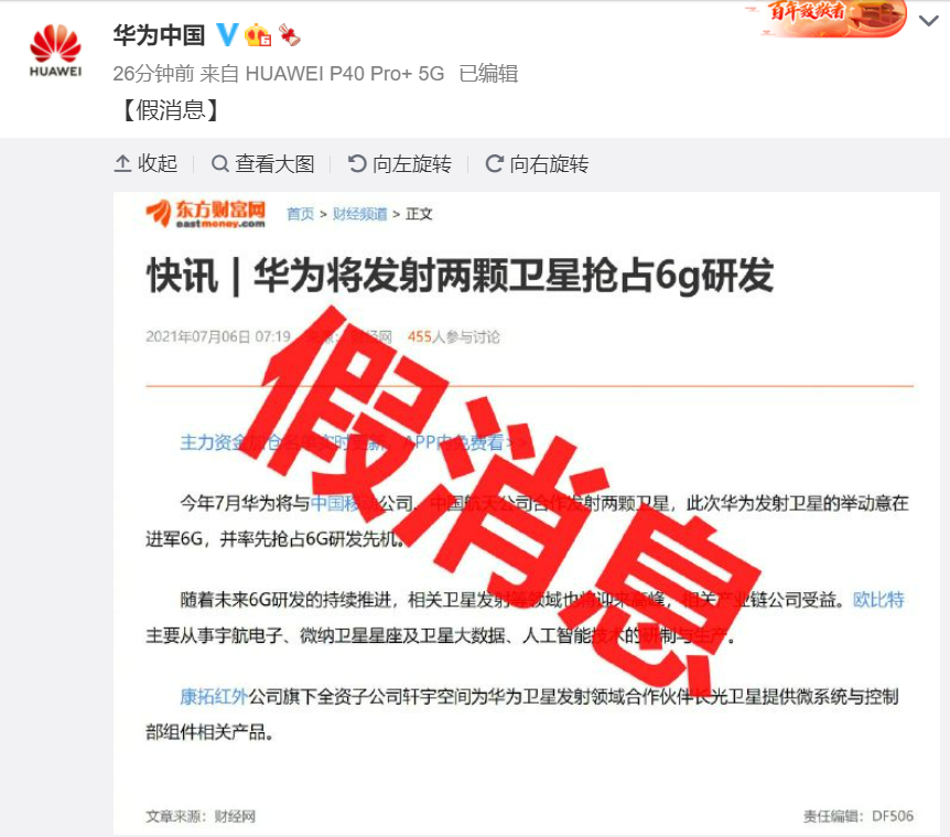 央廣網北京7月6日消息(記者 楊柳青)此前據媒體報道,今年7月華為將與中國移動公司、中國航天公司合作發射兩顆衛星,此次華為發射衛星的舉動意在進軍6G,并搶占6G研發先機。6日上午,華為中國官方微博辟謠,“華為即將發射兩顆衛星以搶占6G研發先機”為假消息。