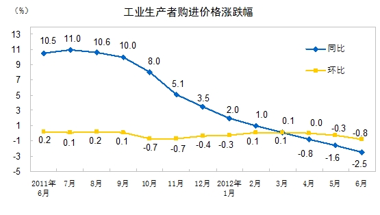 中廣網北京7月9日消息 國家統計局今日公布的數據顯示,2012年6月份,全國工業生產者出廠價格同比下降2.1%,環比下降0.7%。工業生產者購進價格同比下降2.5%,環比下降0.8%。上半年,工業生產者出廠價格同比下降0.6%,工業生產者購進價格同比下降0.3%。