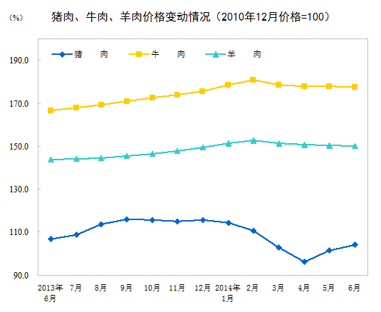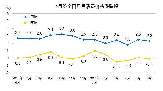 2014年6月份,全國居民消費價格總水平同比上漲2.3%。其中,城市上漲2.4%,農村上漲2.1%;食品價格上漲3.7%,非食品價格上漲1.7%;消費品價格上漲2.2%,服務價格上漲2.6%。上半年,全國居民消費價格總水平比去年同期上漲2.3%。