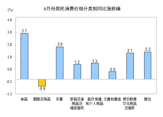 6月份,食品價格環比下降0.4%。其中,豬肉價格上漲2.4%,影響居民消費價格總水平上漲約0.07個百分點;鮮菜、鮮果和水產品價格分別下降4.5%、2.2%和0.6%,合計影響居民消費價格總水平下降約0.21個百分點。