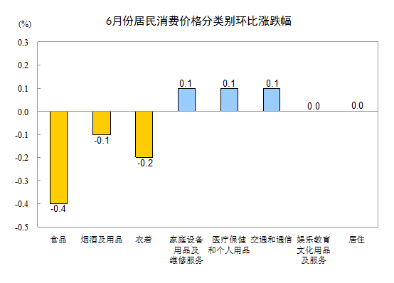 6月份,全國居民消費價格總水平環比下降0.1%。其中,城市下降0.1%,農村下降0.1%;食品價格下降0.4%,非食品價格持平(漲跌幅度為0,下同);消費品價格下降0.2%,服務價格上漲0.1%。